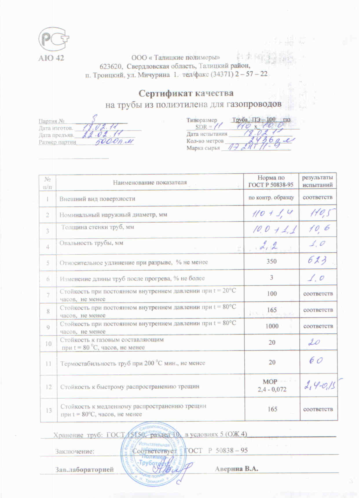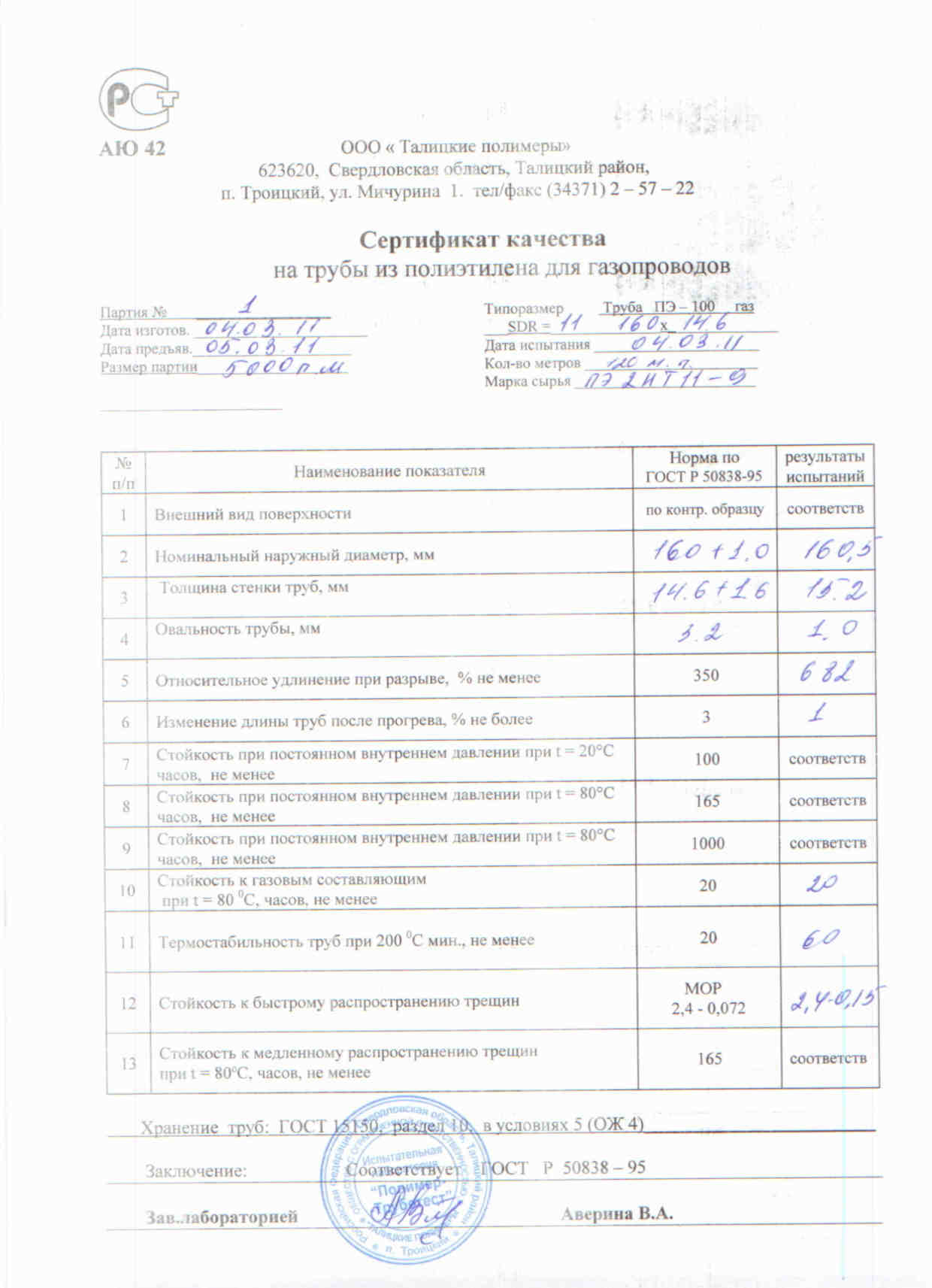 Сертификат соответствия на трубы полиэтиленовые ПЭ 100 для газопроводов