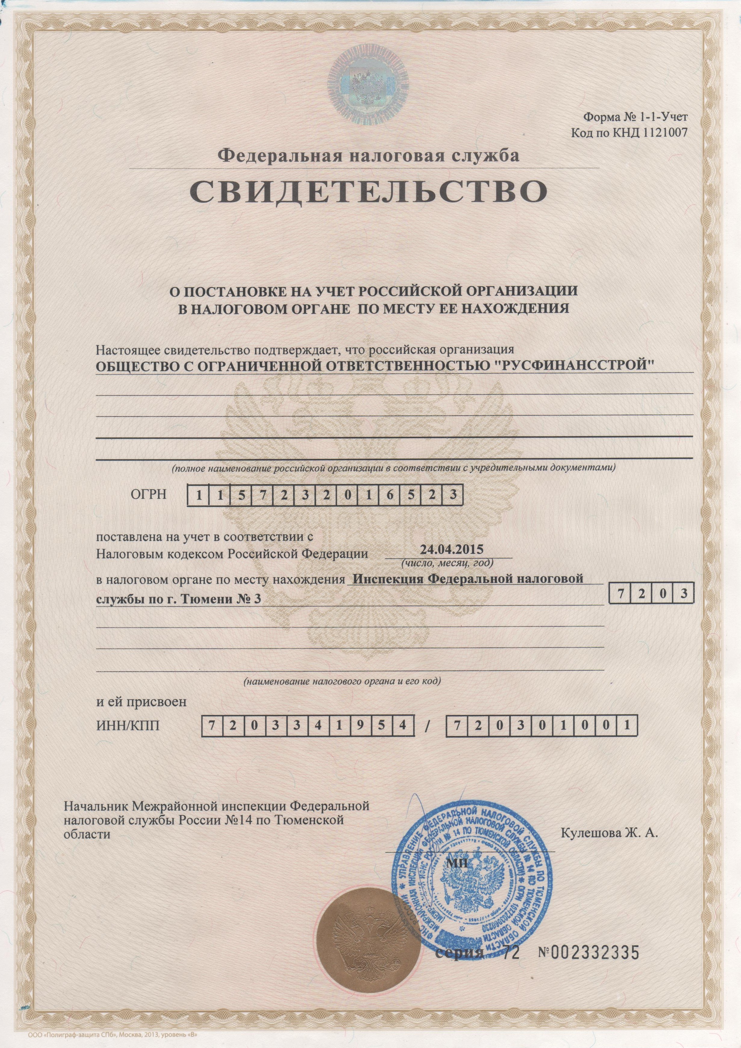 Свидетельство о постановке на учёт в налоговые органы